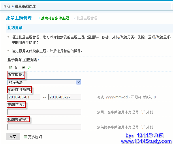 这个功能搜索出符合一定条件的主题,然后进行批量的操作。包括:批量移动到版块、批量移动到分类、批量删除、批量置顶、批量设置精华、批量打开关闭、删除主题中的附件。下面主要介绍一下这个功能的使用方法,进入系统后台 => 内容 => 批量主题管理。