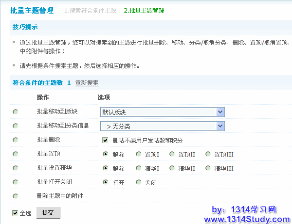 4、批量置顶:是指把帖子批量置顶,或批量解除置顶。
