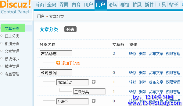 文章分类的设置方法:管理中心 => 门户 => 文章分类