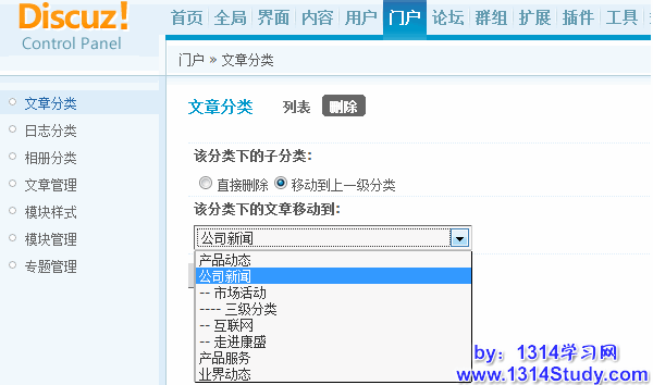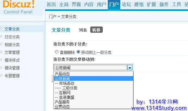 对文章分类进行转移时,可以选择把该分类的文章移动到其他分类中,如果该分类下存在子分类,还需要处理子分类,可以选择把子分类直接删除或是移动一级分类。