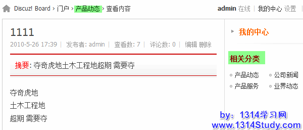 在相应的文章分类后点击“发布文章”,直接进入文章发布页面,填写好文章的各项信息即可发布。查看文章时,可以在导航条中查看文章所属的分类,以及在右边栏显示同级的相关分类。