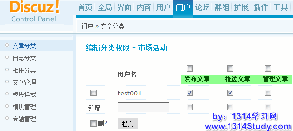 此处可以给指定用户增加在门户发布文章、推送文章和管理文章的权限,使站点的文章管理更加灵活。