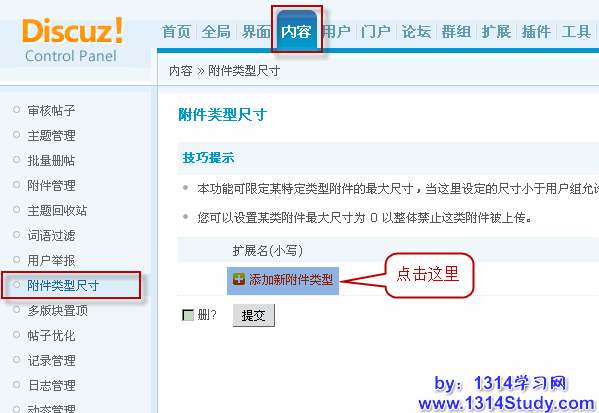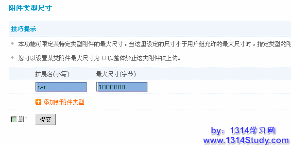 点击 添加新附件类型 按钮。会出现两个文本框,在其中分别填上要限制的扩展名(使用小写英文)和最大尺寸(字节数,仅填数字,不支持 + - * / 运算),然后提交。