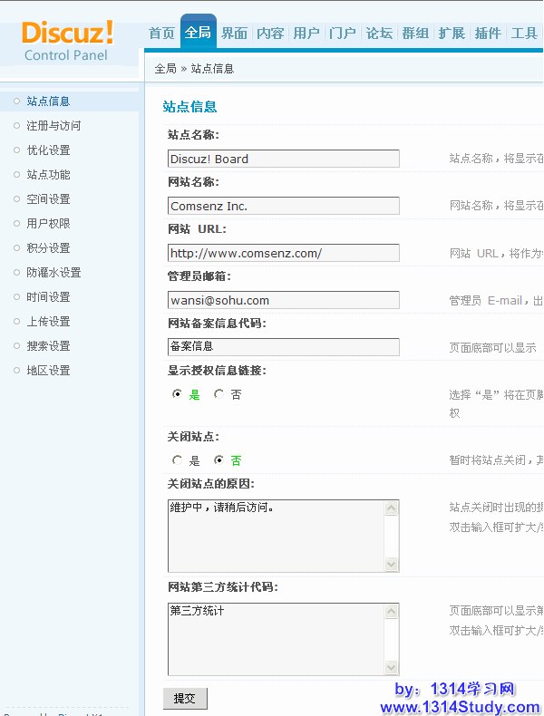 这个功能主要涉及到后台基本设置与论坛的前台显示效果有关的一系列设置。下面主要介绍一下这个功能的使用方法和注意事项。
