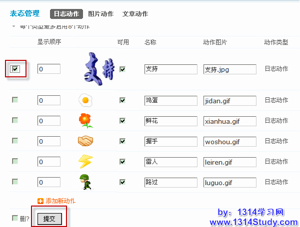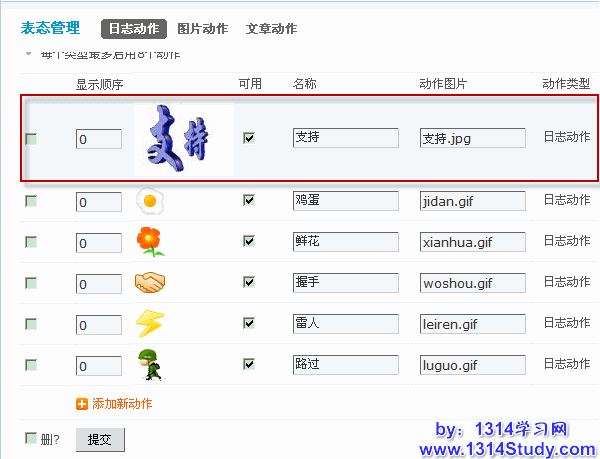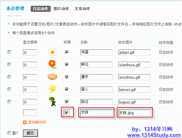 本功能用于设置日志/图片/文章表态动作,动作图片中请填写图片文件名,并将相应图片文件上传到 static/image/click/ 目录中,每个类型最多启用 8 个动作。