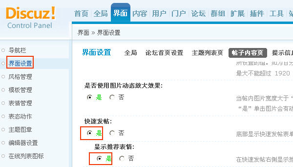 登录 Discuz! X1管理后台 => 界面 => 界面设置 => 帖子内容页 => 快速发帖 => 选择“是”,显示推荐表情,选择“是”。