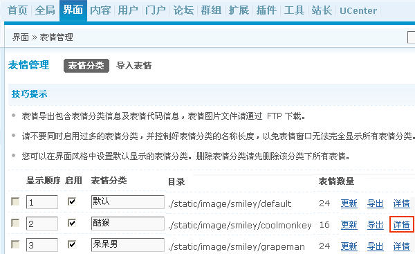 Discuz! X1管理后台 => 界面 => 表情管理 => 选择想要在快速回复中推荐的表情,点击“详情”如下图所示: