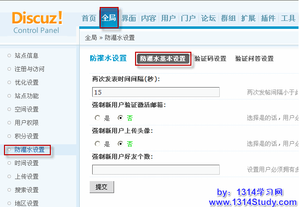一、防灌水基本设置:后台 => 全局 => 防灌水设置 => 防灌水基本设置,如下图所示: