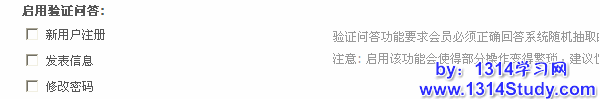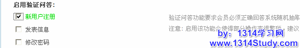 1、启用验证问答:在这里设置要启用验证问答的地方(新用户注册,发表信息,修改密码),开启后会员必须正确回答系统随机抽取的问题才能继续操作,如下图所示: