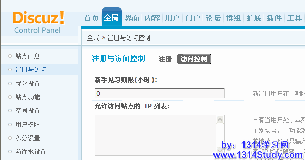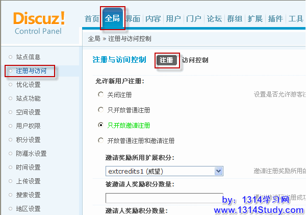 四、注册限制设置:后台 => 全局 => 注册与访问 => 注册,如下图所示: