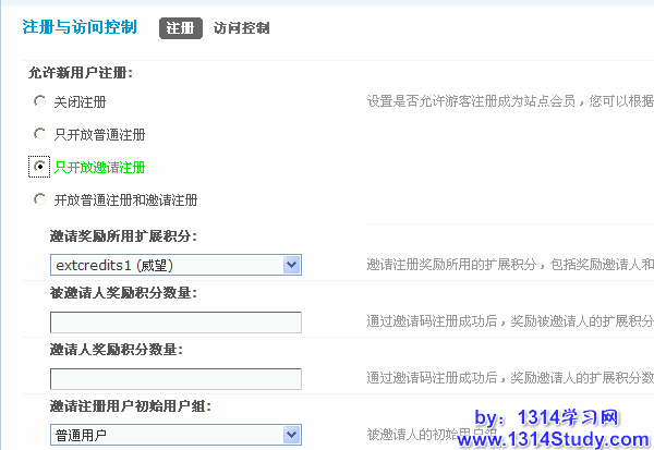 1、允许新用户注册:在这里设置,只开放邀请注册。这样只有收到邀请链接的人才能注册成为站点的会员,如下图所示: