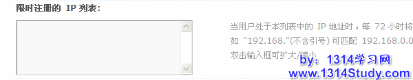 5、限时注册的IP列表:当用户处于本列表中的 IP 地址时,每 72 小时将至多只允许注册一个帐号。每个 IP 一行,既可输入完整地址,也可只输入 IP 开头,例如 "192.168."(不含引号) 可匹配 192.168.0.0~192.168.255.255 范围内的所有地址,留空为不设置,如下图所示: