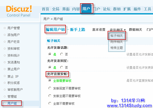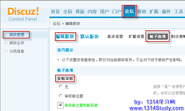 六、后台开启帖子审核,防止灌水,以下两个地方要配合使用,只有都设置了审核,发帖才需要审核。