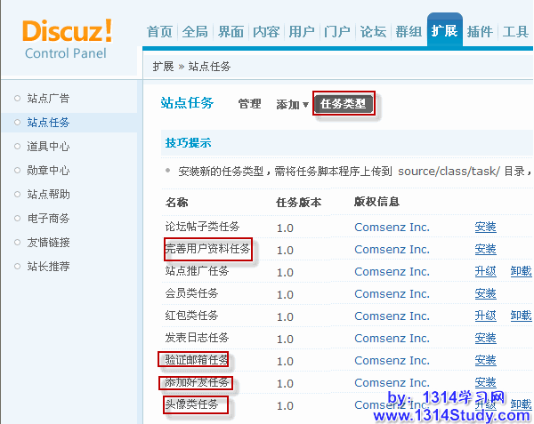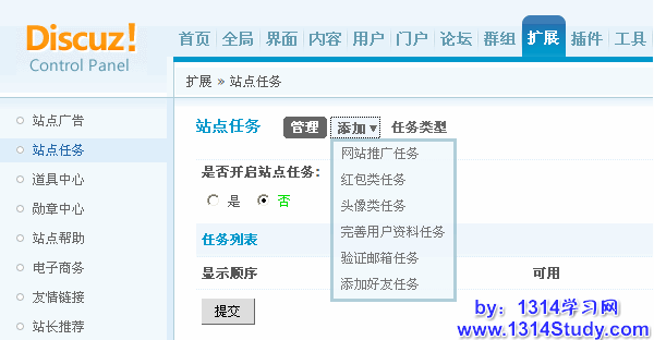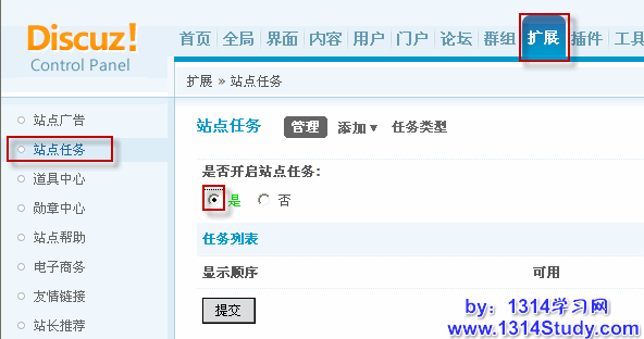 七、后台 => 扩展 => 站点任务,开启站点任务,完成任务给相应的积分等奖励,没有积分的会员不能进行其他操作。如下图所示: