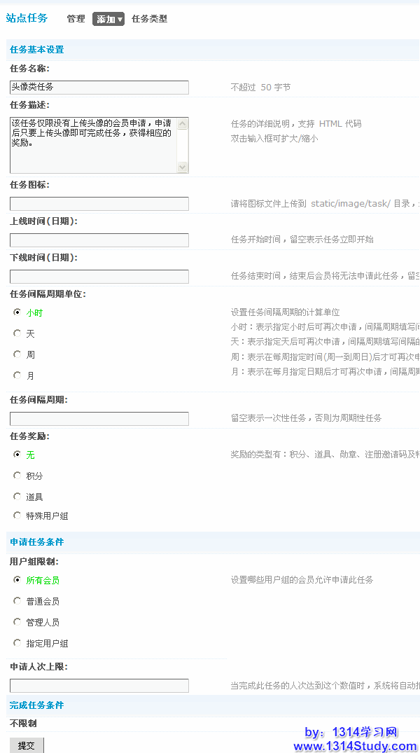 添加,添加安装的任务类型,设置具体的任务奖励,任务可申请的用户组等。如下图所示: