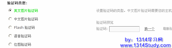 4、验证码类型:这里选择验证码的类型,有五种类型可以选择。需要注意的是如果开启中文图片验证码,需要您的主机支持 FreeType 库;如果开启 Flash 验证码,建议您的主机开启 Ming 库以提高安全性,如下图所示: