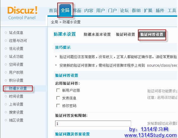三、验证问答设置:后台 => 全局 => 防灌水设置 => 验证问答设置,如下图所示: