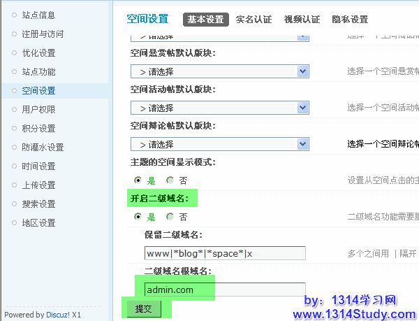1、后台 => 全局 => 空间设置 => 基本设置 => 开启二级域名,如下图所示: