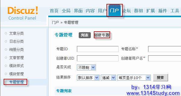 1、进入后台 => 门户 => 专题管理,选择创建专题,如下图所示:
