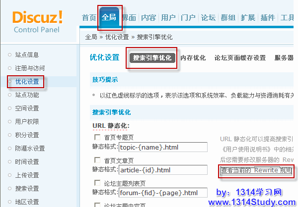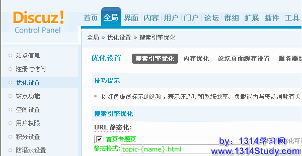 2、后台 => 全局 => 优化设置 => 搜索引擎优化 => URL 静态化,勾选首页专题页,如下图所示: