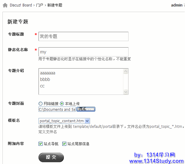 5)模板名:在下拉菜单中选择专题使用的模板名。如果要使用自定义的模板,请将模板文件上传到 template/default/portal 目录下,文件名必须为 portal_topic_*.htm,* 为自定义文件名。