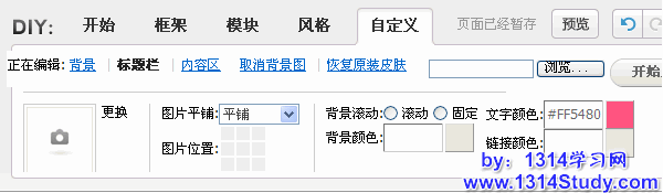 4)自定义:分背景,标题栏和内容区,来设置背景颜色,背景图片,文字颜色及连接颜色,如下图所示:
