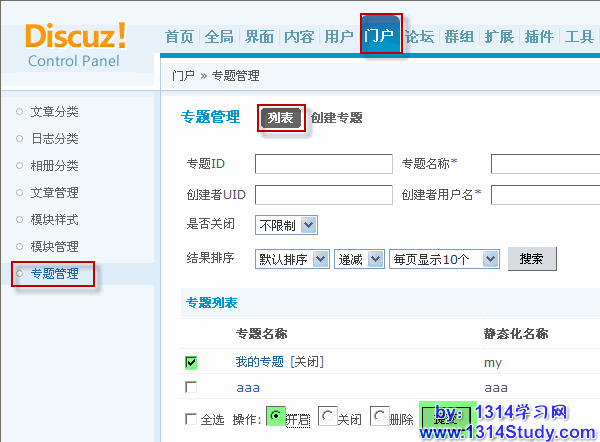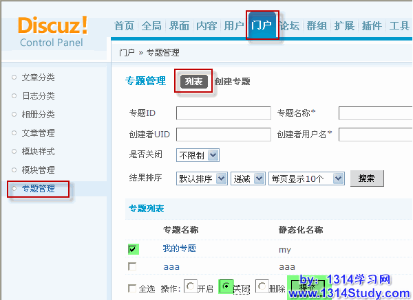 2)勾选专题前面的复选框,然后选择开启前的复选框,点击提交即可开启专题,如下图所示: