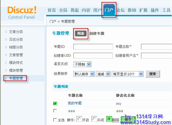 2)勾选专题前面的复选框,然后选择删除前的复选框,点击提交即可删除专题,如下图所示: