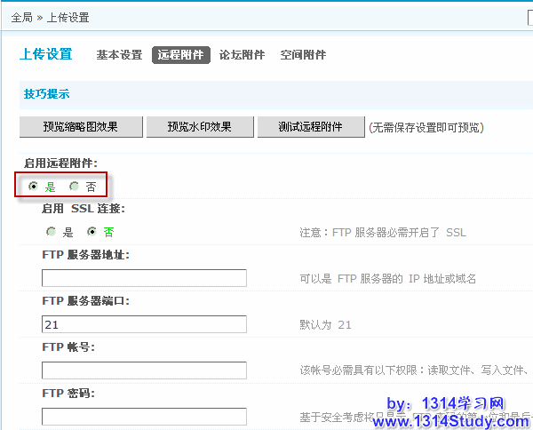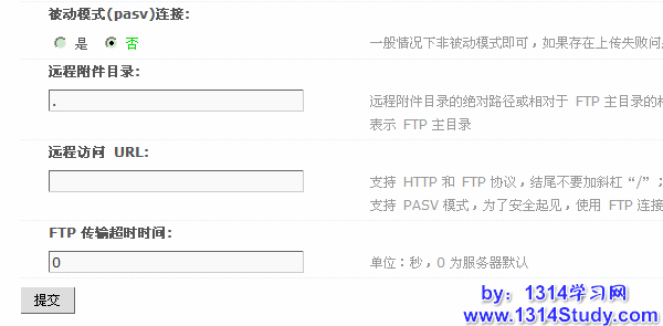 4)远程访问 URL:支持 HTTP 和 FTP 协议,结尾不要加斜杠“/”;如果使用 FTP 协议,FTP 服务器必需支持 PASV 模式,为了安全起见,URL浏览附件FTP连接的帐号不要设置可写权限和列表权限。