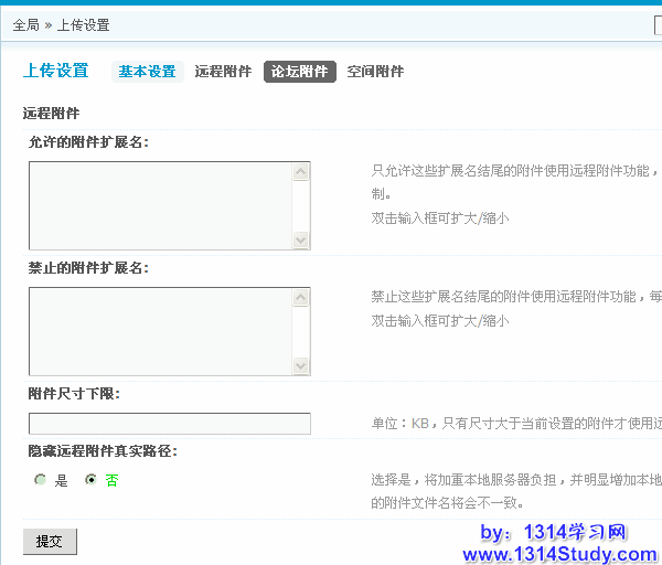在站点启用了远程附件后,还可以在 管理中心 => 全局 => 上传设置 => 论坛附件 中设置远程附件允许和禁止的扩展名、附件尺寸下限、及是否隐藏远程附件的真实路径。