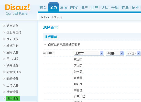 与之前版本不同的是,Discuz! X1 版本可以在后台编辑地区,方便快捷,不再需要修改模板文件了。
