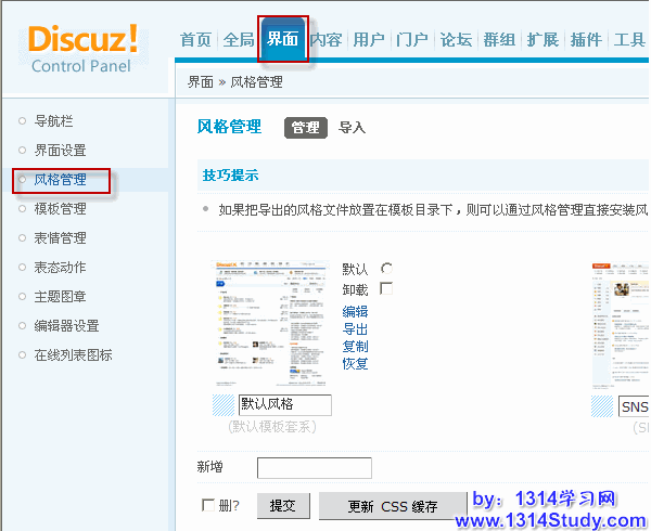 七、导入新风格:后台 => 界面 => 风格管理 => 导入,如下图所示: