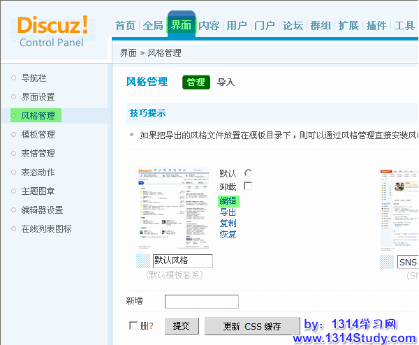 通过风格管理,您可以设置论坛的默认风格,也可以设置页面的颜色、背景等显示,还可以导入自己下载下来的风格。