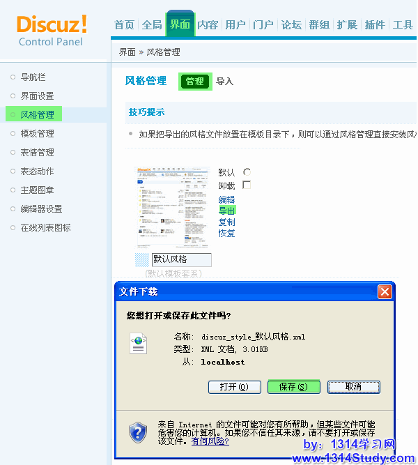 二、导出风格:后台 => 界面 => 风格管理 => 管理 => 导出,如下图所示: