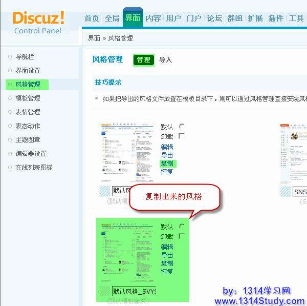 三、复制风格:后台 => 界面 => 风格管理 => 管理 => 复制,如下图所示: