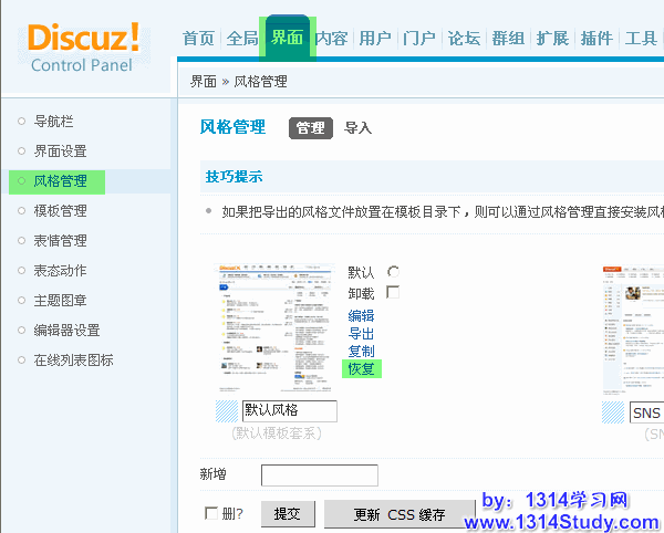 四、恢复风格:后台 => 界面 => 风格管理 => 管理 => 恢复,如下图所示: