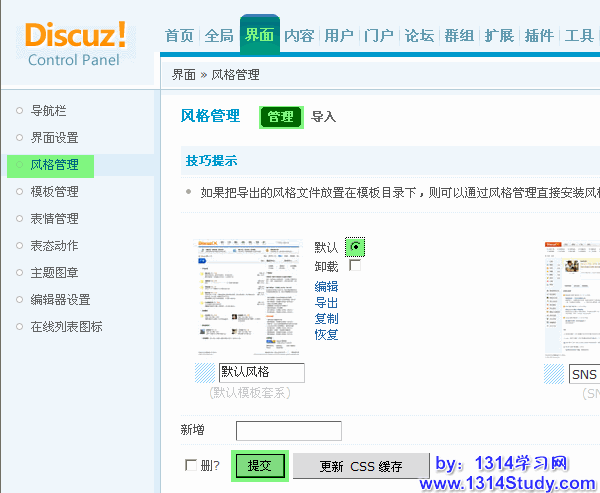 五、设置默认风格:后台 => 界面 => 风格管理 => 管理,勾选要设置为默认风格旁边的“默认”复选框,点击提交即可,如下图所示: