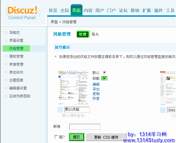 六、卸载风格:后台 => 界面 => 风格管理 => 管理,勾选要卸载的风格旁边的“卸载”复选框,点击提交即可,如下图所示: