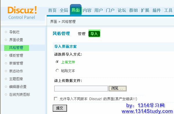 2、允许导入不同版本 Discuz! 的界面:勾选此复选框,允许导入不同版本 Discuz! 的界面,但容易发生错误。建议使用相同版本的风格。