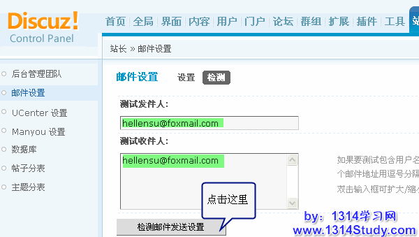 2、站点创始人登录 Discuz! X1 的后台 => 站长 => 邮件设置,如下图所示: