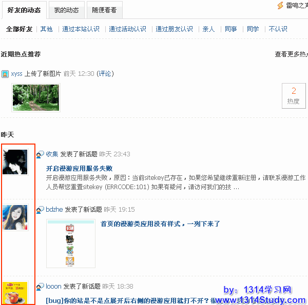 与 UCenter Home 的动态(feed)相比较,新版个人空间的动态加强了以“人”为中心的功能,不再仅仅以展示信息为主。具体体现在动态的更新就是“会员”动态的更新,这个会员无论是发了日志、传了照片还是发起投票等行为,都体现为:“会员头像”+“动态”,让会员真实感受到人与人之间的“联系”无处不在。Discuz! X1 动态如下图所示: