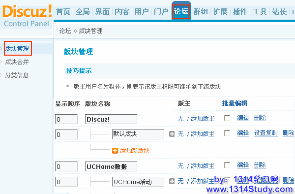 站长可以在管理后台管理论坛版块,包括添加新分区、添加新版块、添加子版块、为版块添加版主、设置版块显示顺序及编辑、删除版块等。