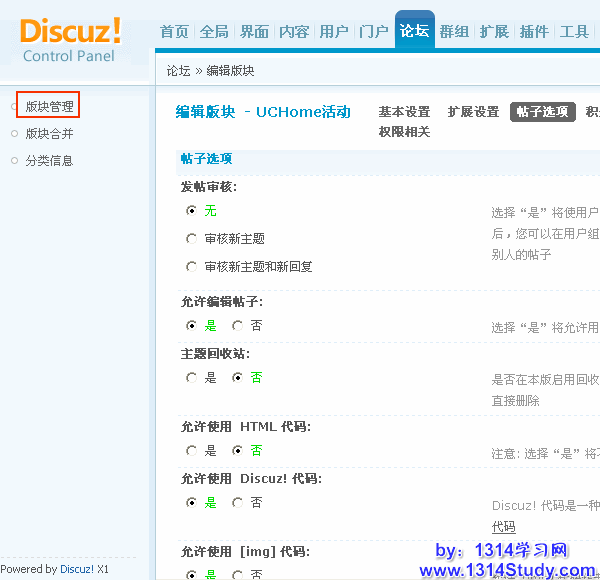 Discuz! X1后台 => 论坛 => 版块管理 => 编辑 => 帖子选项: