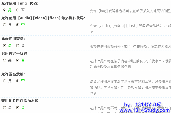 禁用图片附件添加水印:选择“是”将不对本版块上传的图片附件自动添加水印,即便 全局设置中开启了此项功能。选择“否”为按照系统默认设置决定是否添加水印;