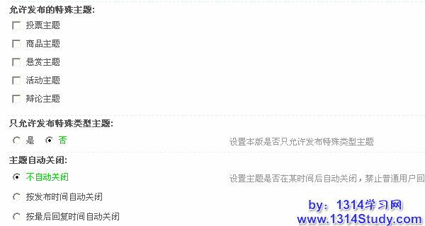 主题自动关闭:设置本版块主题是否在某时间后自动关闭,禁止普通用户回复;如果要自动关闭,还可以设置自动关闭的时间;