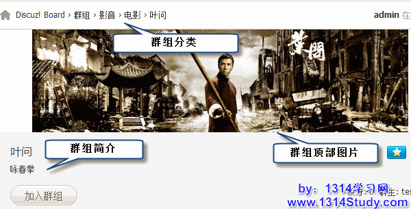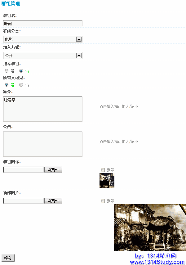 在对指定群组进行详情管理时,可以管理其群组名、分类、加入方式、是否推荐,是否所有人可见,以及群组的简介、公告、图标、顶部图片等。Discuz! X1 新增加的群组的自定义顶部图片功能,可以使群组的表现力更加丰富,用户可以选择能够体验群组特性的个性化图片装饰群组页面。