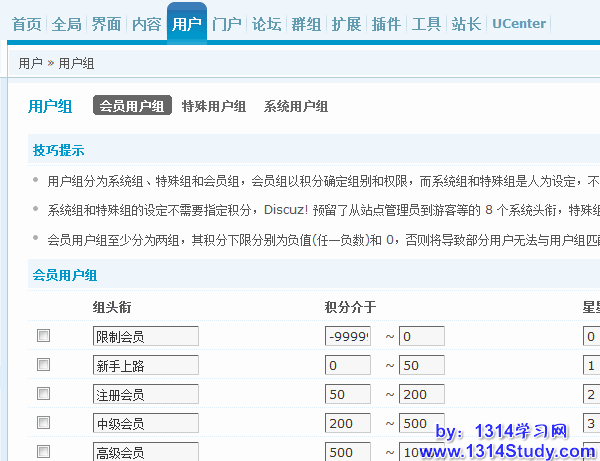 Discuz! X 按照用户组的机制来对论坛的会员进行权限管理和分配,我们可以在管理中心中管理用户组。