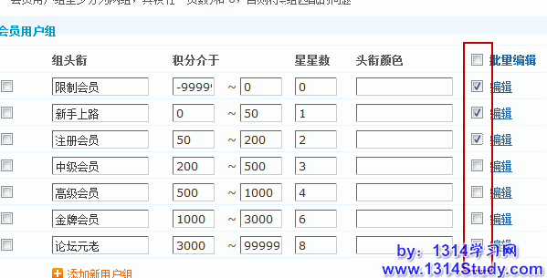 Discuz!X 中新增了用户组的批量编辑功能,在要编辑用户组的时候,选择多个用户组,然后点击批量编辑,就可以进入批量编辑界面。