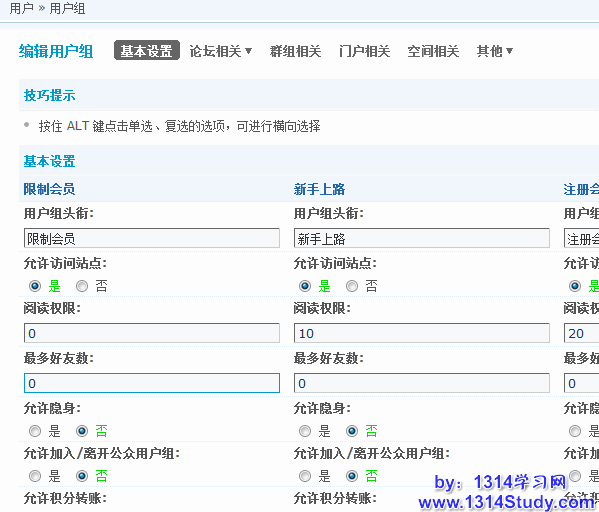 从这里,就可以方便的批量设置多个用户组的设置了。