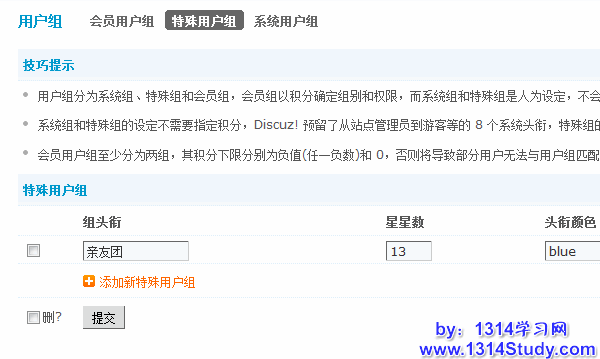 点击“添加新特殊用户组”,可以添加一个新的用户组,可以自定义组头衔,星星数,头衔颜色和组头像。